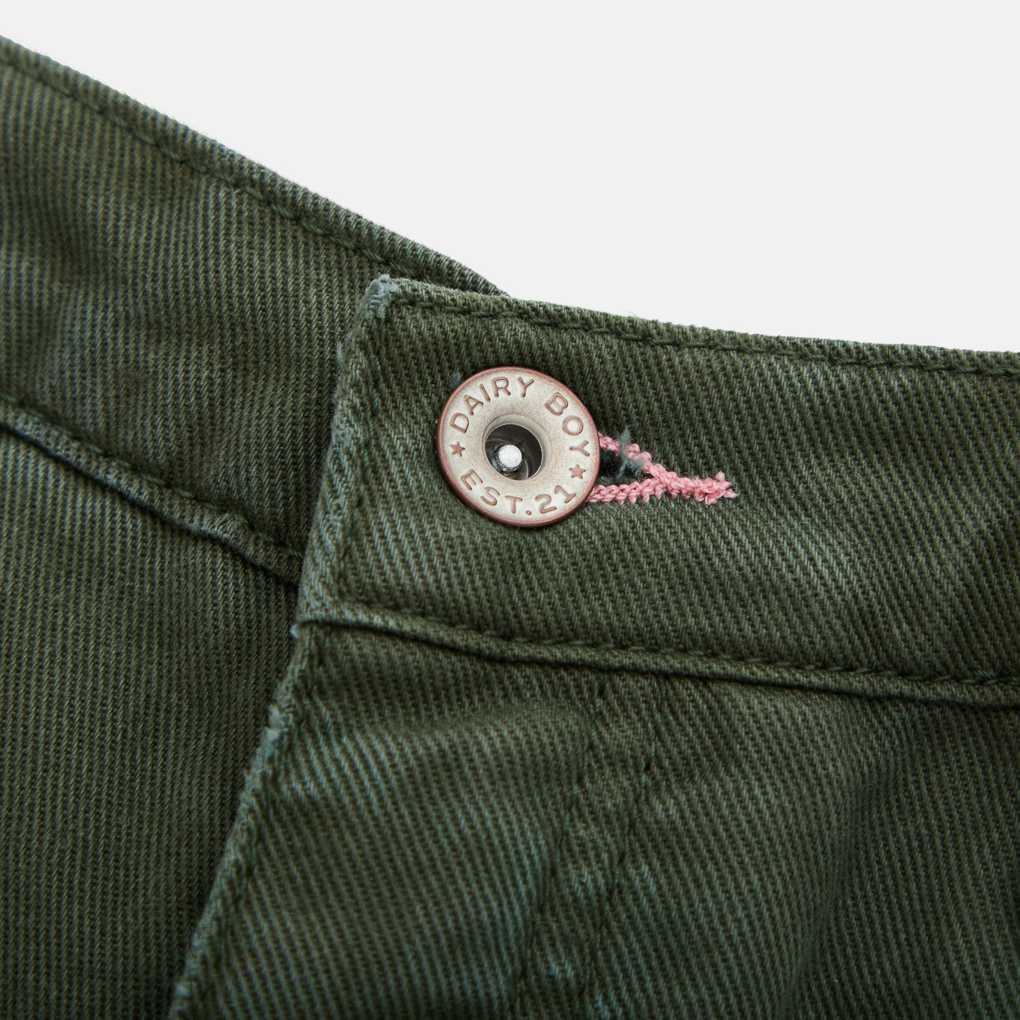 A classic, functional silhouette built for daily wear. Soft, broken-in comfort with sweet but durable details that hold through movement or rest, made to be relied on, over and over. Designed with a mid-rise, straight-leg fit and finished with signature Dairy Boy touches. A true unisex style. We recommend sizing up if you desire a more low-rise, oversized fit.