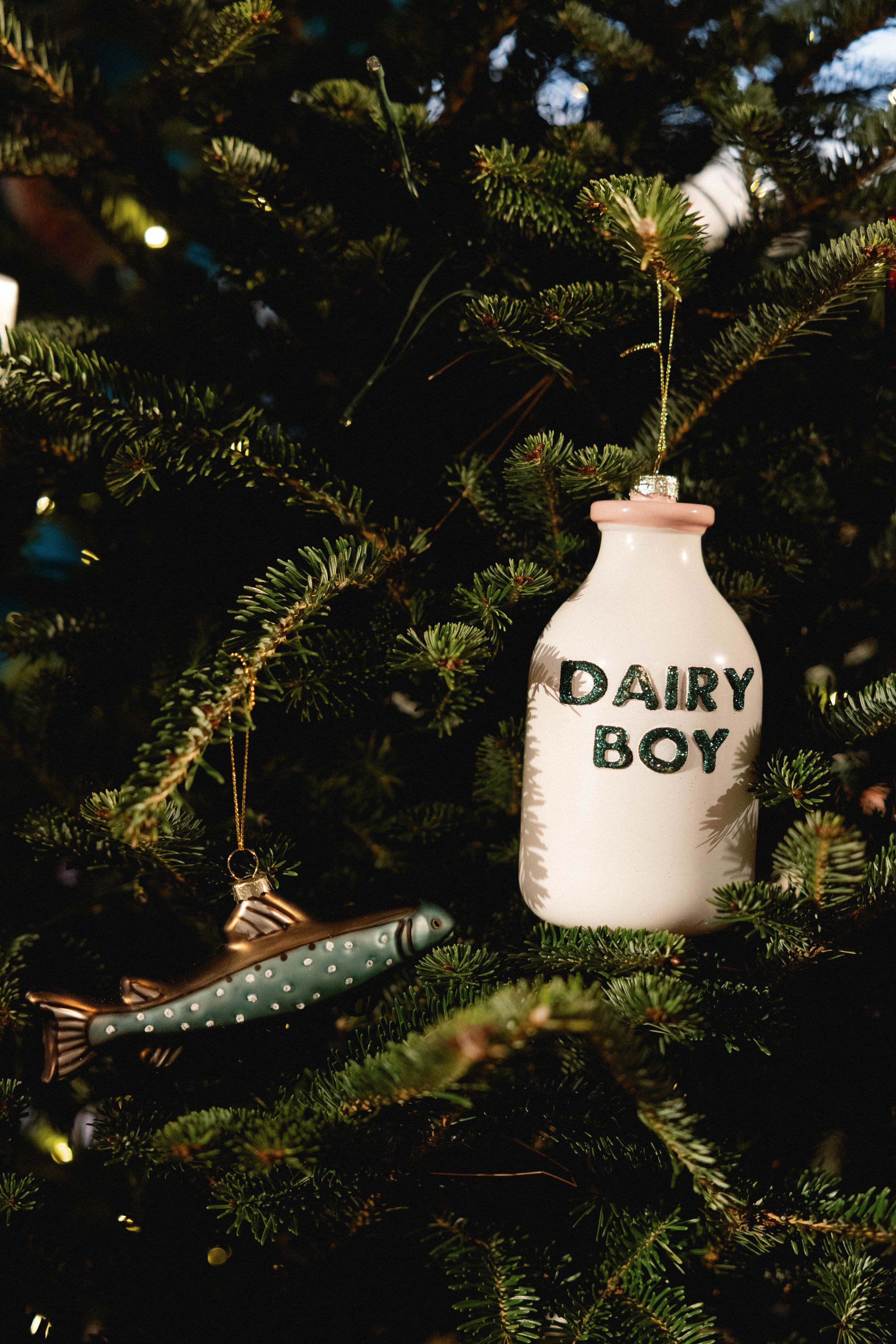 Custom fish and Dairy Boy milk bottle ornament set