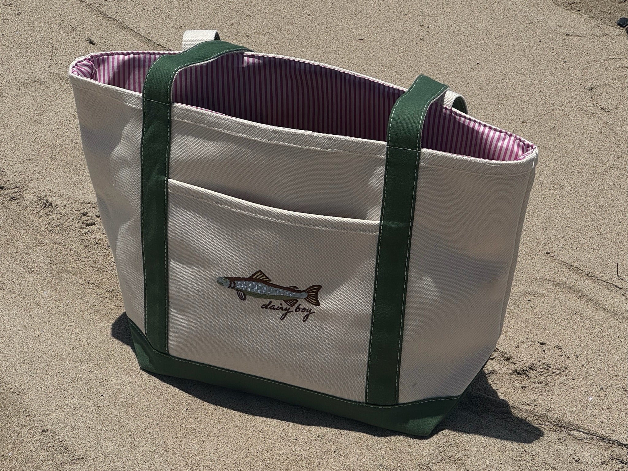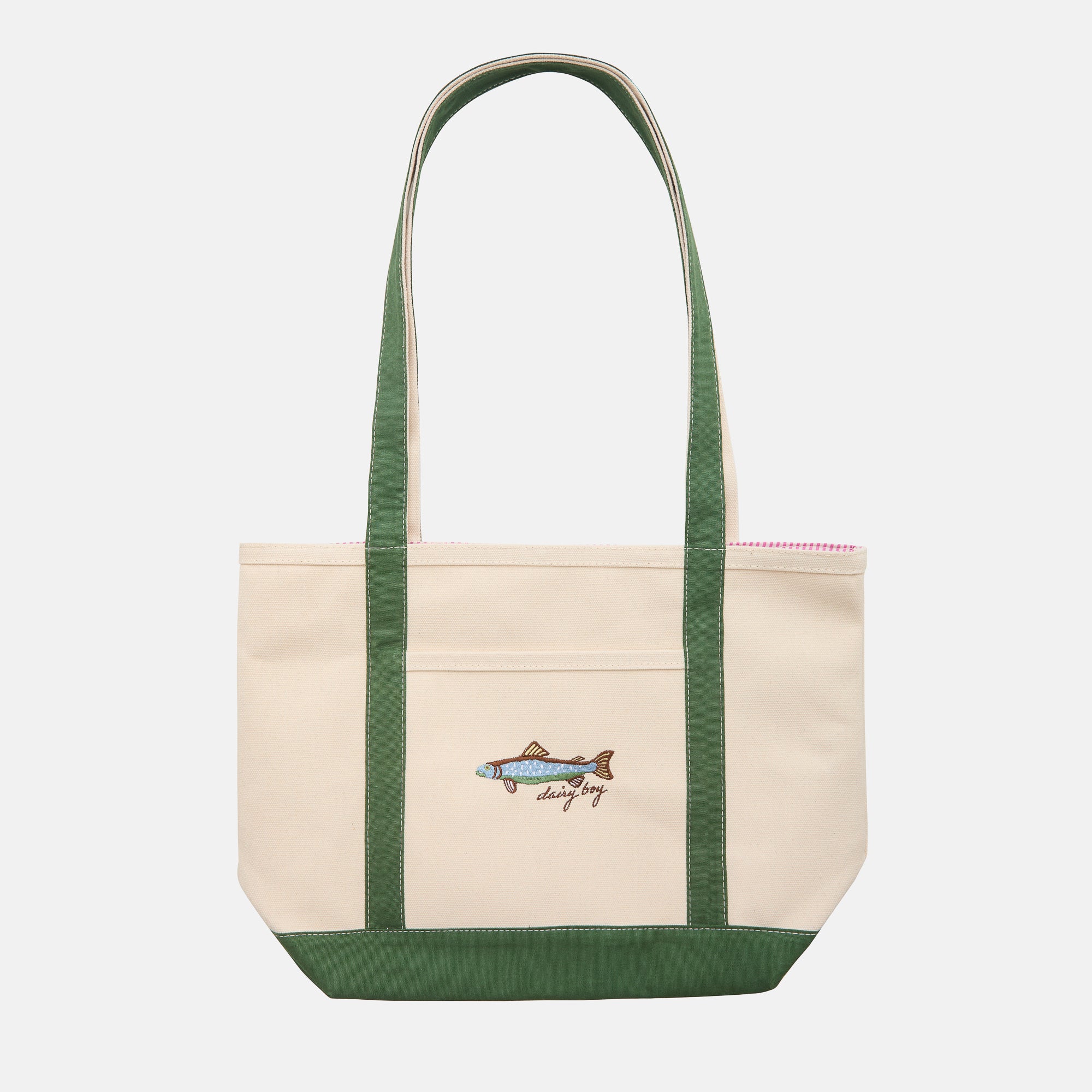 Built for the long haul (and the farmers market). This classic canvas tote is crafted from heavyweight cotton with contrast green straps and base for a vintage-inspired look. Features an exterior pocket embroidered with the Dairy Boy fish logo. Fully lined with a pop of pink ticking stripe, it’s roomy enough for a towel, snacks, and a paperback, with sturdy shoulder straps that are made to carry the day.