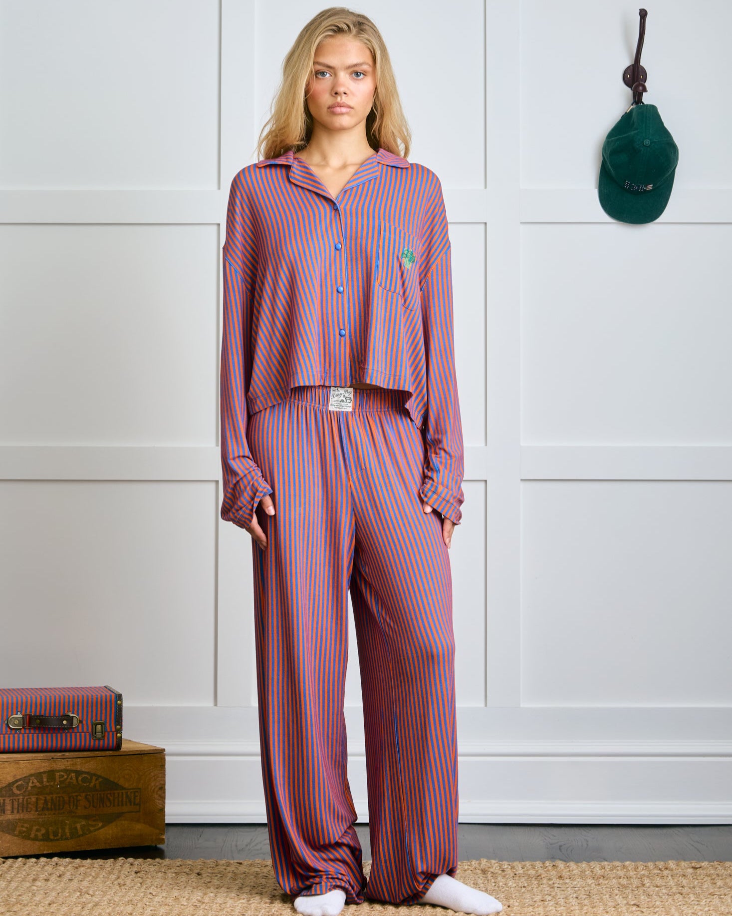 Made for slow summer mornings in the garden. This set is crafted in our classic butter fabric you know and love. Featuring cross stitch embroidered vegetables & fruits on the chest pocket, it’s a sweet nod to homegrown charm. Finished with candy dot buttons, it’s as playful as it is soft—designed to bring joy to your everyday routine.