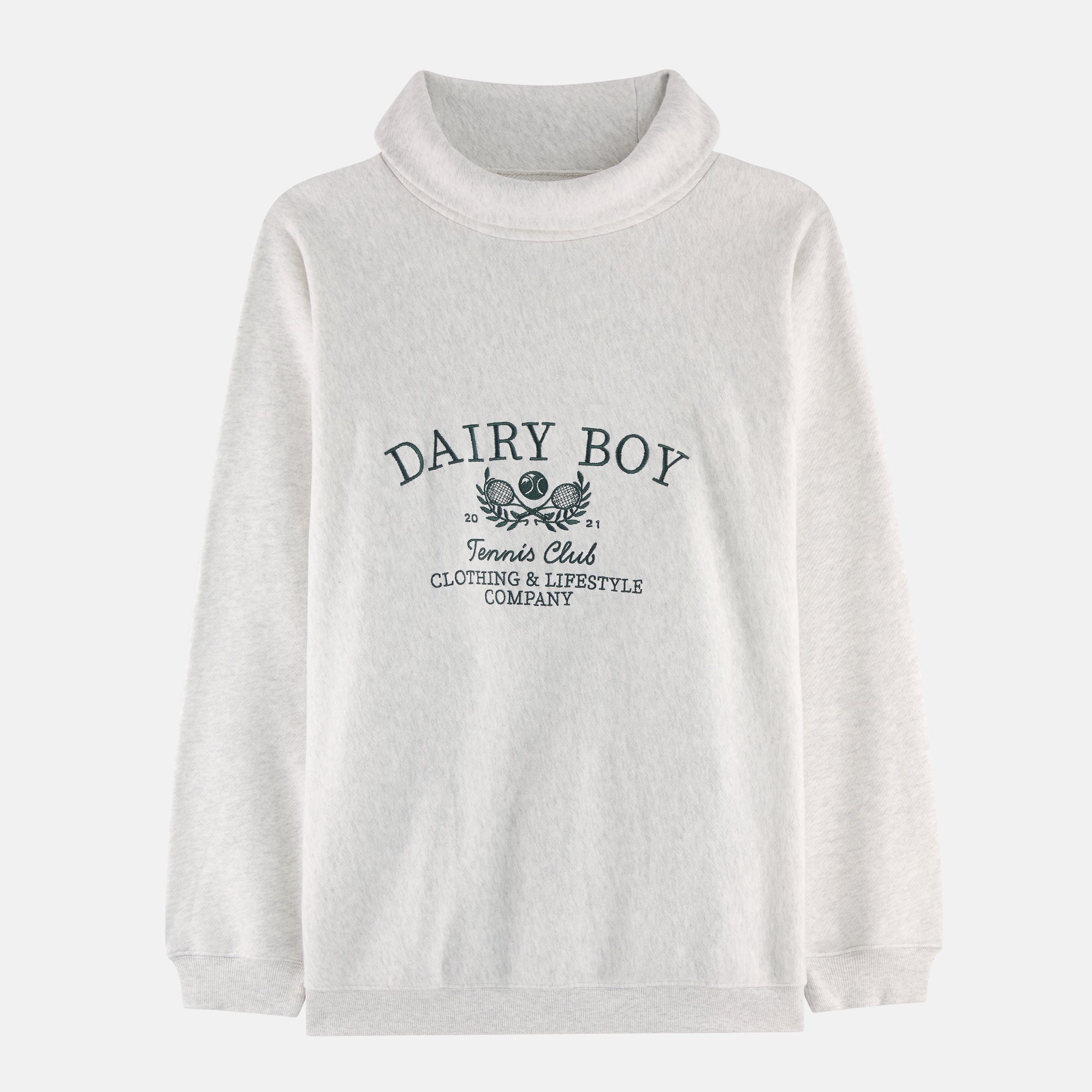An oversized rollneck sweatshirt in warmup gray. Designed with a vintage courtside spirit, it’s the ultimate throw-on layer—athletic, easy, and cool with our embroidered tennis-club graphic at center front.