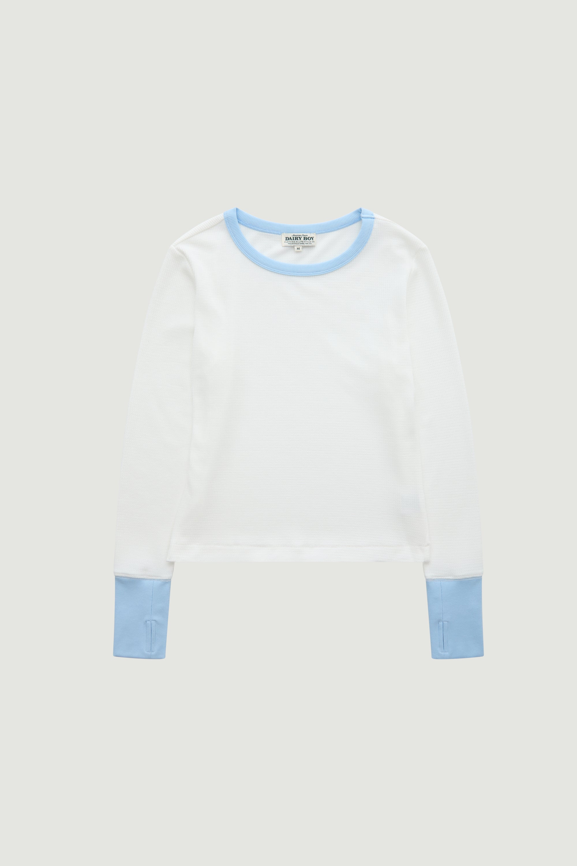 A fitted thermal with a classic crew neckline, extra long sleeves, and a slightly cropped body. Finished with contrast rib trims and a sporty thumb loop detail. Soft, comfortable, and endlessly wearable on its own or layered under your favorites.