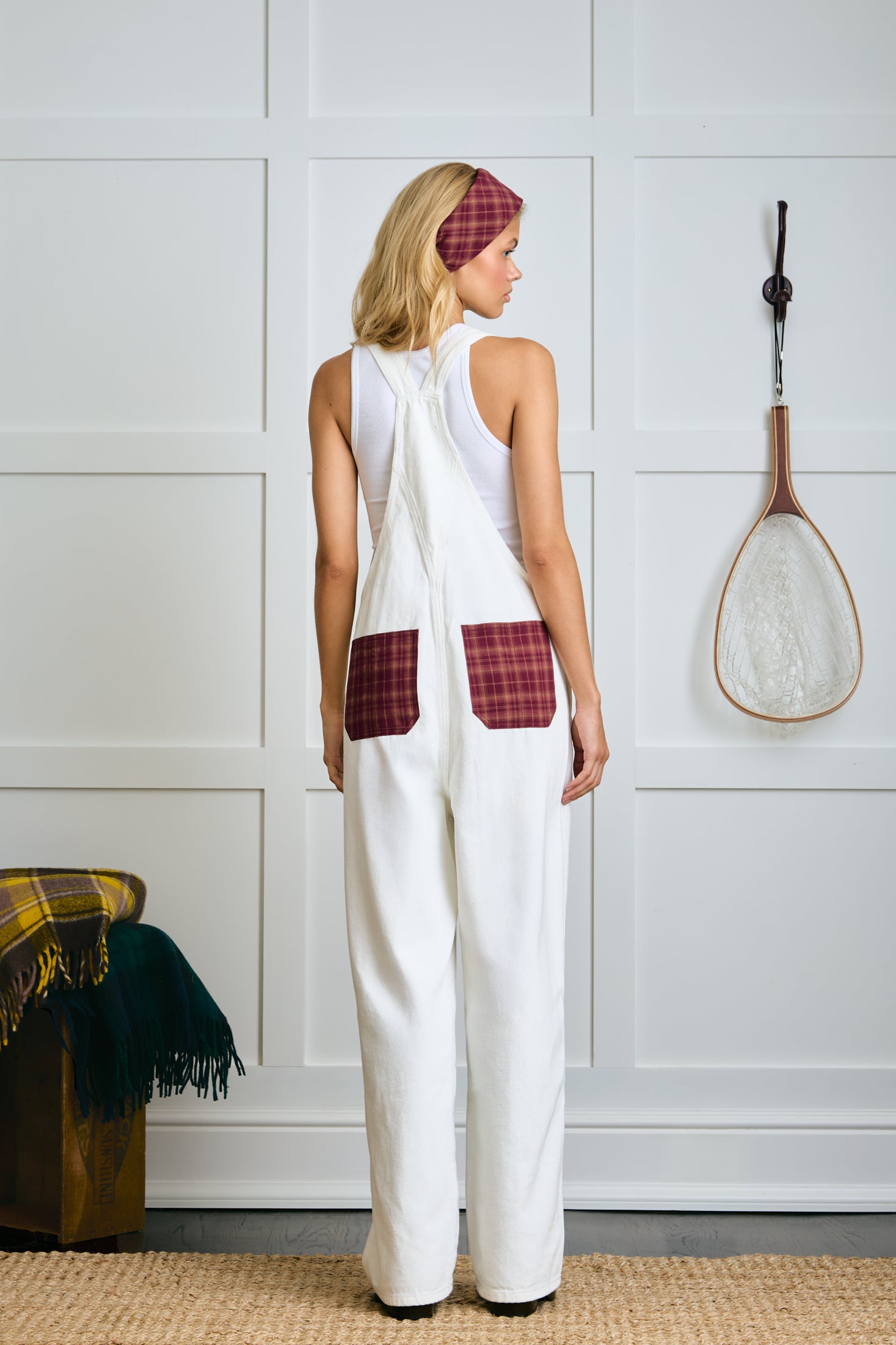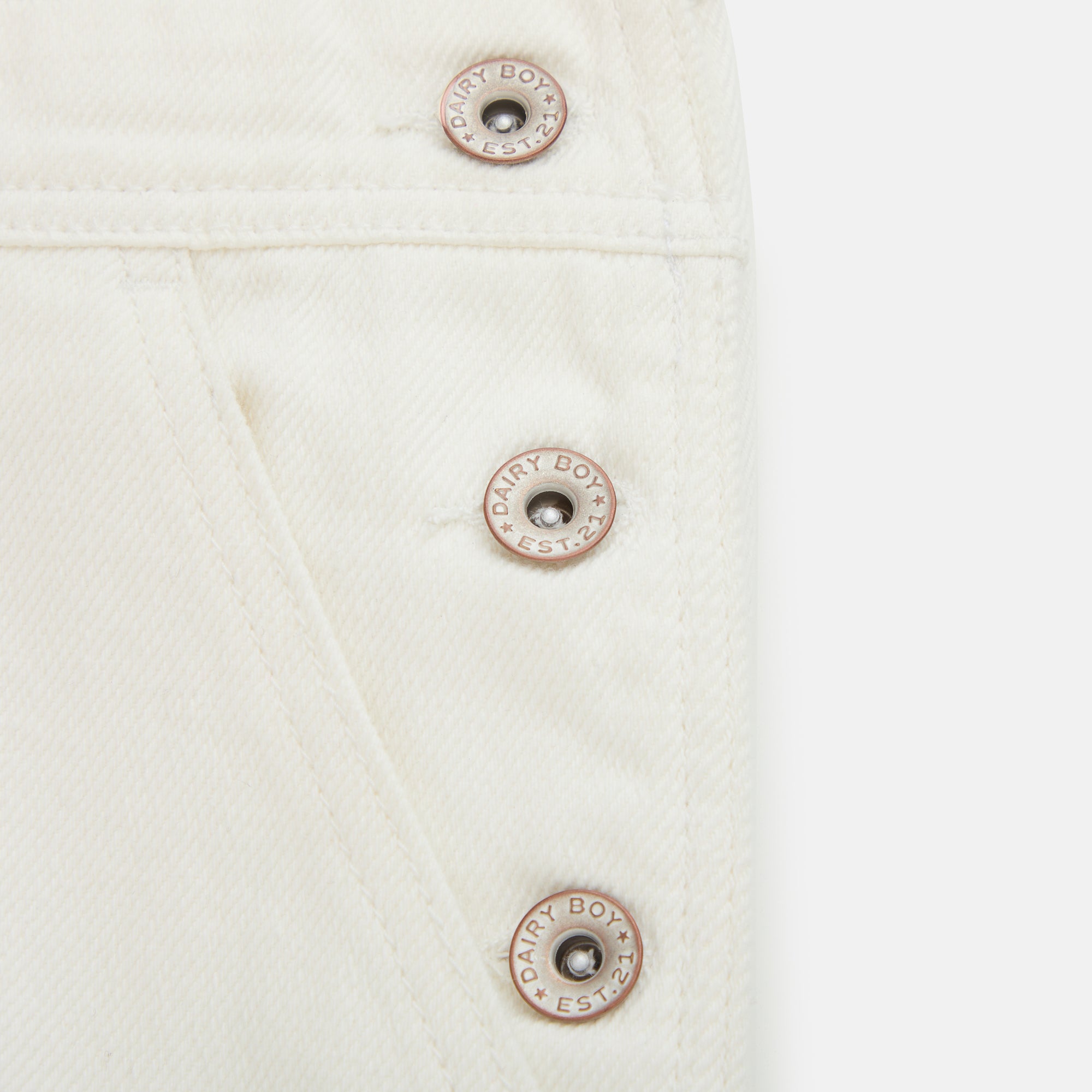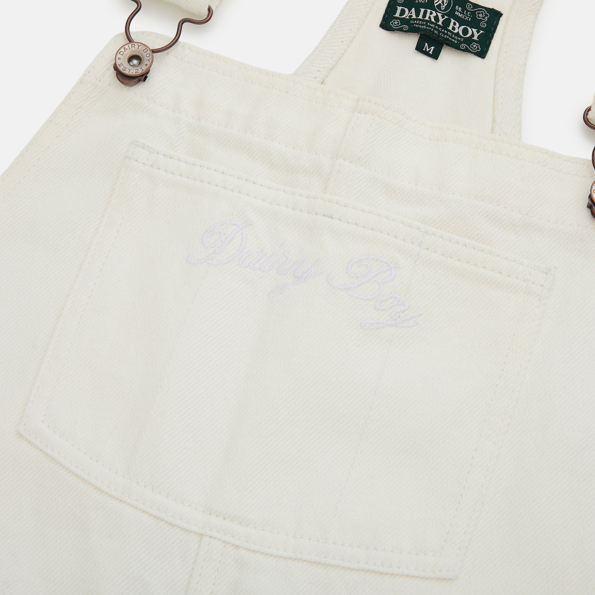 Just the cutest overalls. They’d be kinda basic like “ya they’re cute but they’re just white overalls”. No. The plaid pocket detailing on the booty? The cutest. The dairy boy buttons and dairy boy script on the front? Darling.