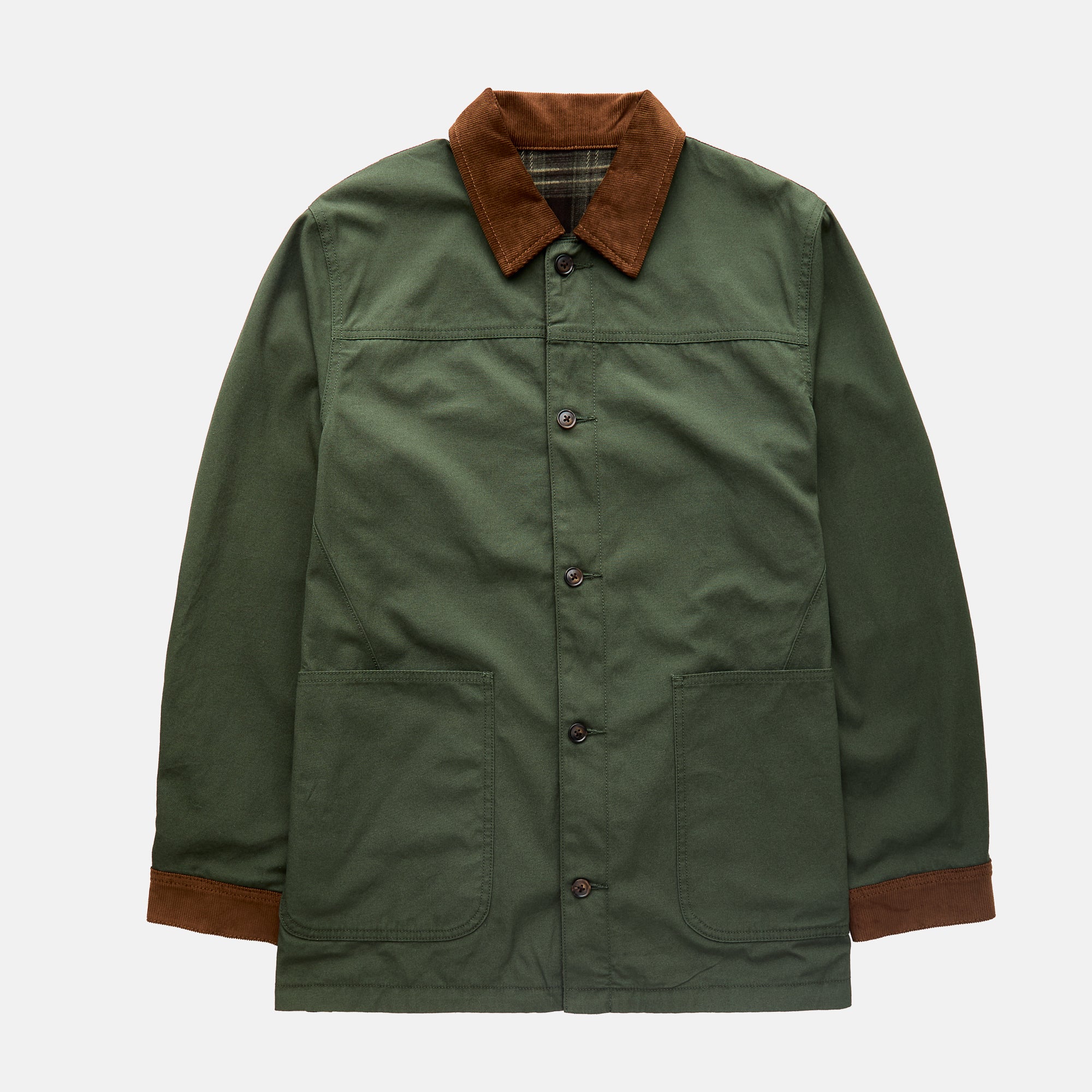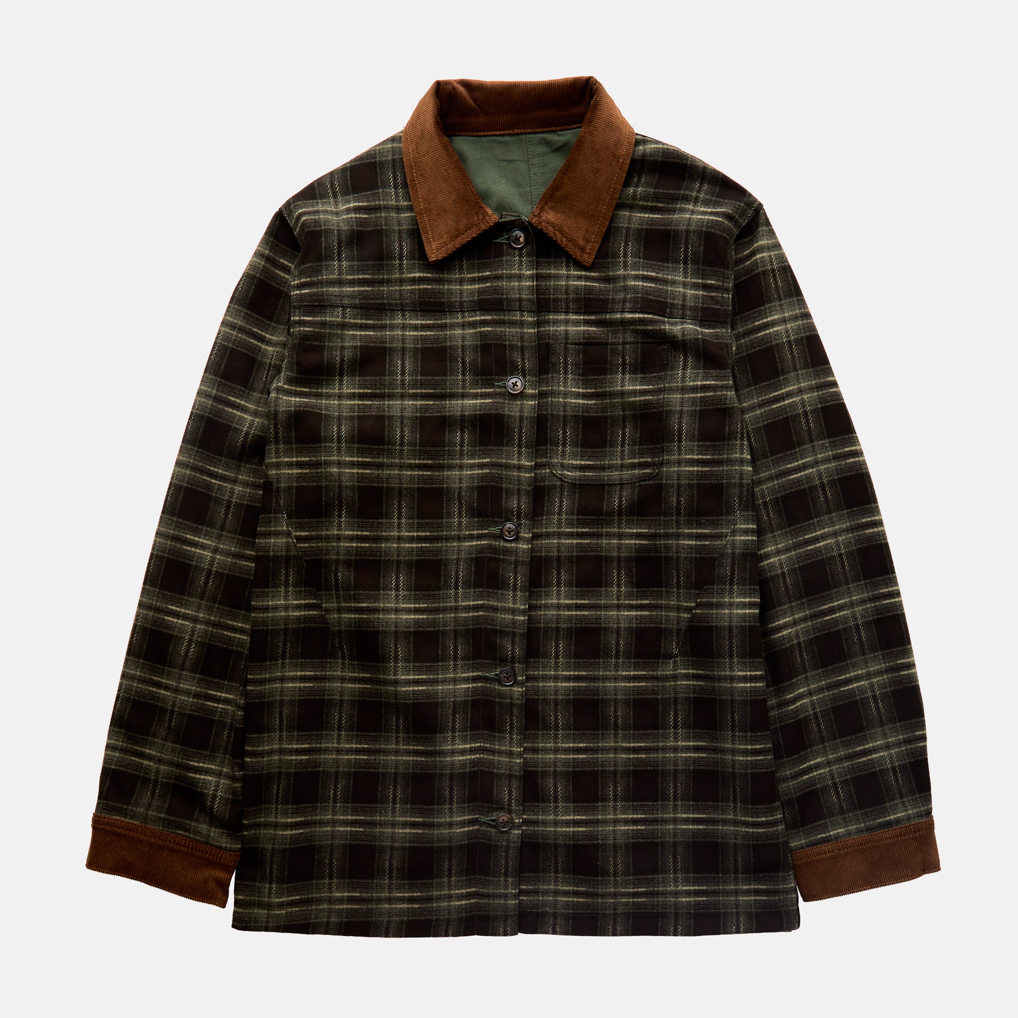 An oversized, elevated take on the classic barn jacket. Designed for everyday wear, it’s fully reversible—plaid on one side, solid on the other—finished with a corduroy collar and cuffs, patch pockets, and a button-up closure.