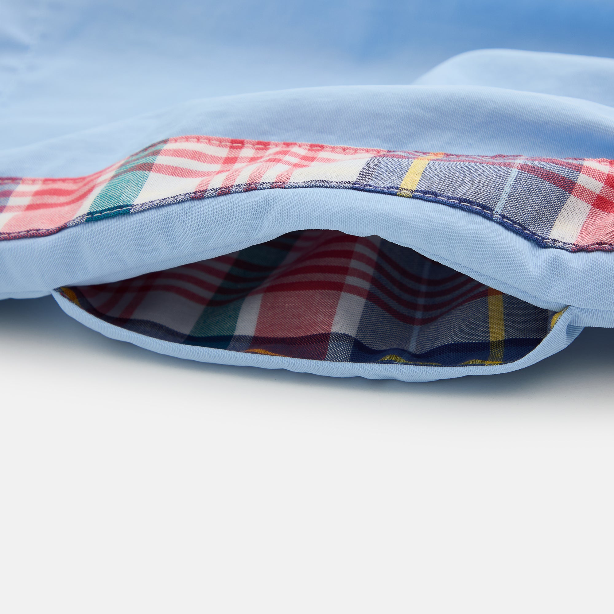 - Curved hem with contrast binding